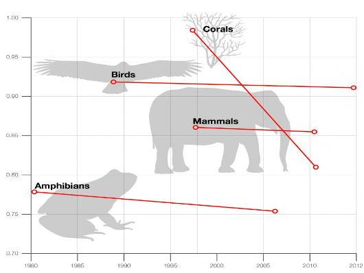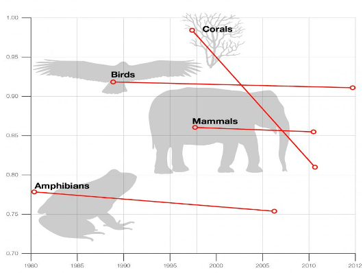 Biodiversity indicatorsare metrics that show how a specific part of biodiversity is changing. Common examples include the Red List Index showing average species extinction risk and the Living Planet Index showing average change in vertebrate species abundance.These tools are used to inform important decisions about policy, resource allocation and conservation efforts. The key message of an indicator must be clear so we can easily see and interpret the state of nature. We can present indicators as a single line that changes over time as the state of nature changes. But this simplification can obscure information thatmay affect our resulting conservation plans.