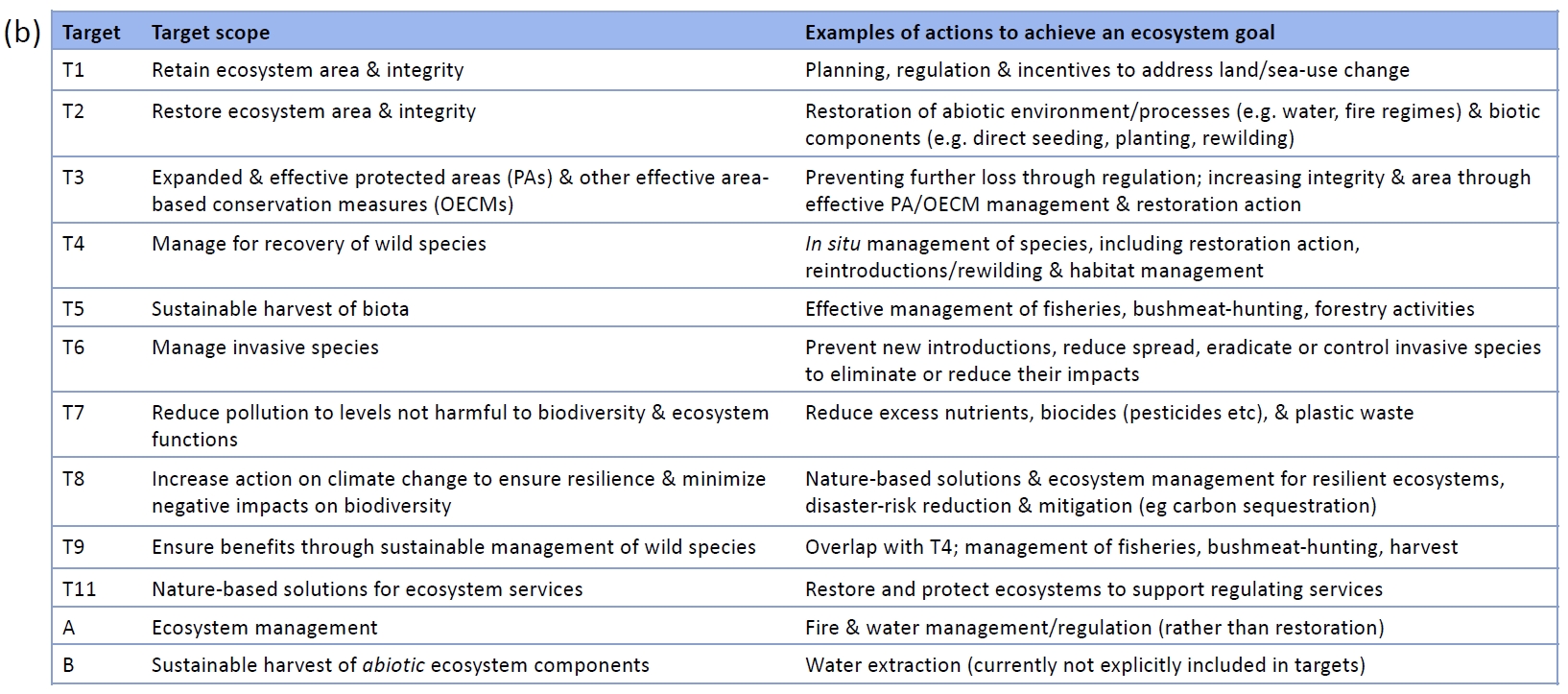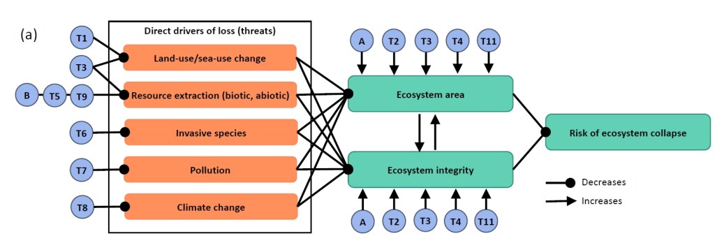 Figure 1. In our theory of change (a), drivers (orange) cause declines in integrity and area, in turn increasing risk of ecosystem collapse (ecosystem goal components, in green). The theory of change enables pathways for targets (blue circles) to contribute to achieving the goal to be identified, including safeguarding remnants of threatened ecosystems, restoring their area and integrity to reduce collapse risk, and retaining intact areas. The targets listed (b) are drawn from the first post-2020 draft (where T1 is Target 1 and so forth).